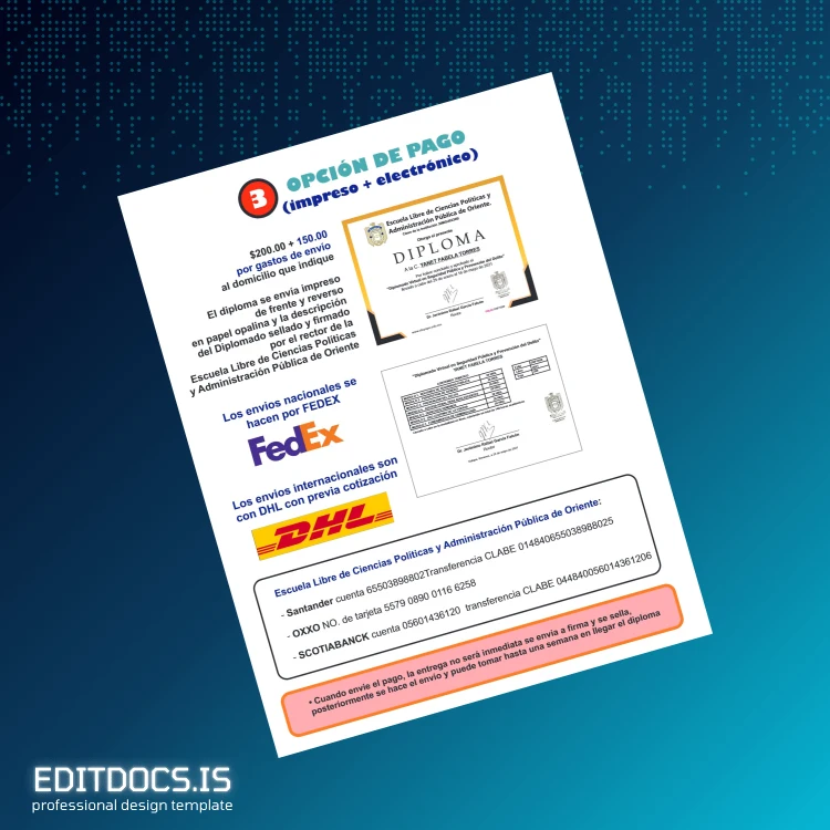 Start your customization journey by exploring our extensive collection of editable diploma templates, specifically crafted to suit a variety of professional and academic needs. The Mexico Escuela Libre de Ciencias Políticas y Administración Pública de Oriente Diploma template stands out with its unique design that closely mimics the original document.