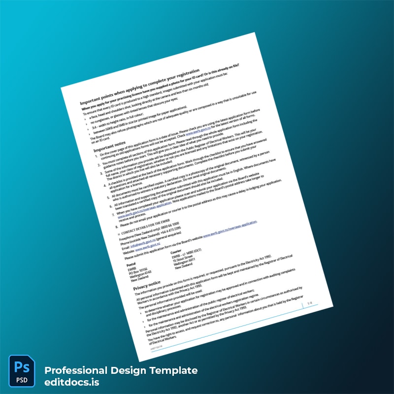The New Zealand Electrical Registration Application Template (Word & PDF) is designed specifically to simplify and expedite the often complex task of submitting your electrical registration. Crafted for professionals who need a reliable, easy-to-use tool, this certificate of business registration template ensures that you can complete your application efficiently without compromising on accuracy or professionalism.