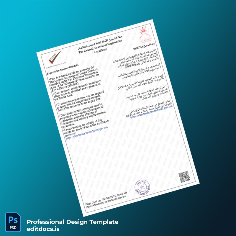 Editable Oman General Secretariat Registration Certificate Template (Word & PDF)