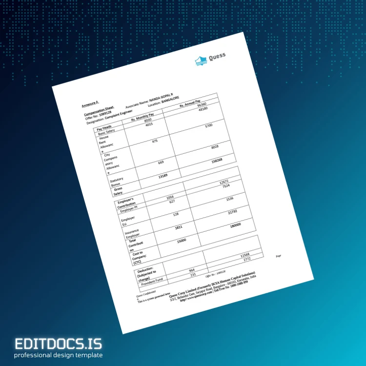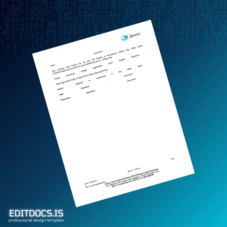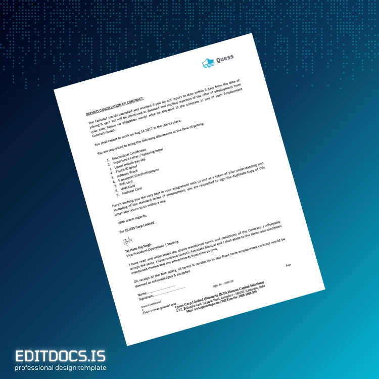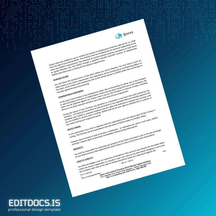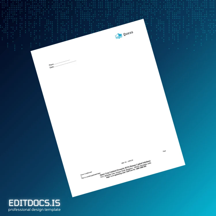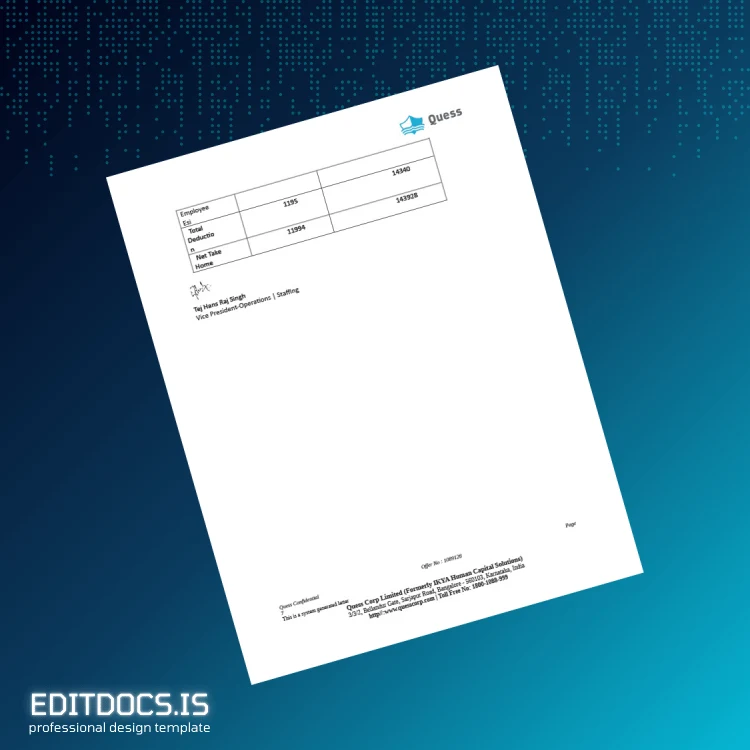 Don’t let complicated templates slow you down. Choose this job confirmation letter template to create precise and credible employment verification letters within moments. Its ease of use and comprehensive features make it an indispensable asset for every HR toolkit. Click to download your editable Quess Corp Limited employment verification letter template in Word and PDF today and transform how your organization validates employment information.