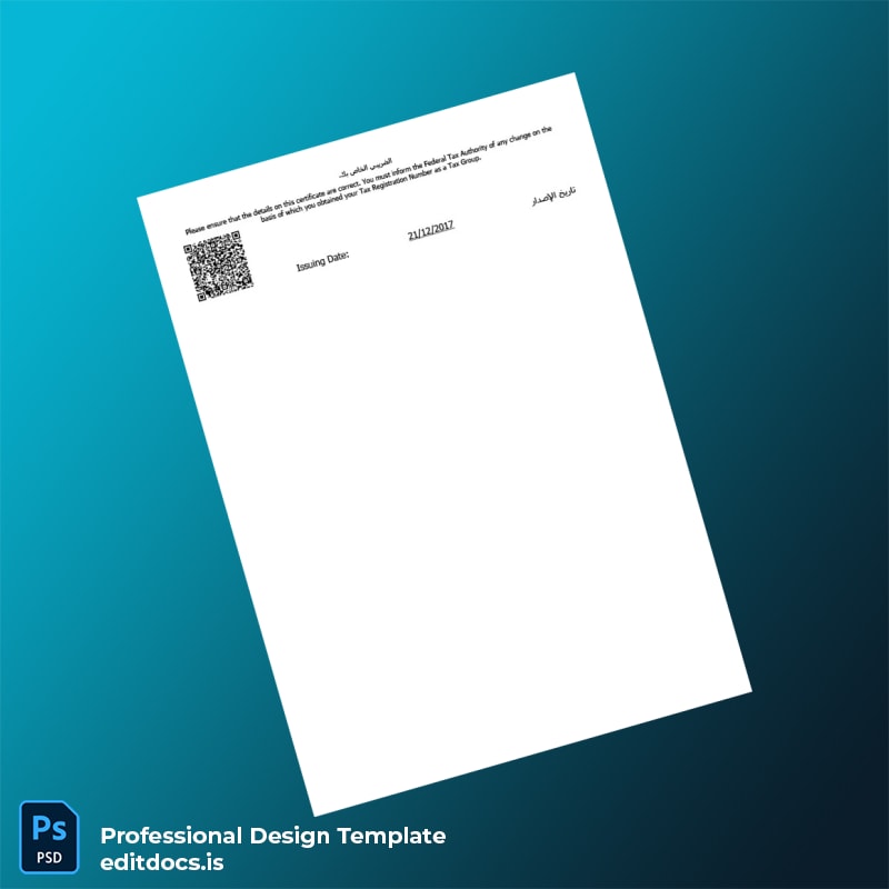Introducing the Editable UAE Federal Tax Authority VAT Registration Certificate Template, designed for professionals seeking a swift and reliable solution to update or recreate their important tax documentation. Whether you are replacing a lost certificate or need an official-looking document for compliance, this template offers unmatched convenience and versatility.