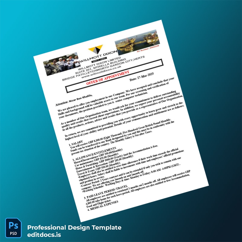 Editable United Kingdom Willmott Dixon Employment Verification Letter Word and PDF Template. Quickly customize proof of employment letters with ease and professionalism.