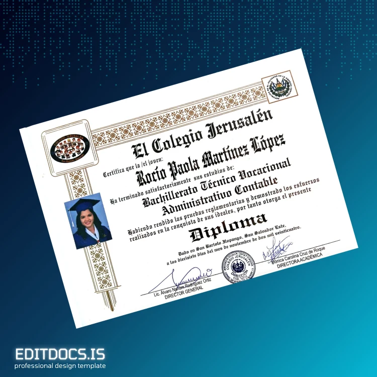 This fully editable diploma template is designed for quick and professional customization, ideal for those seeking a high-quality re-creation of the El Salvador Colegio Jerusalén High School Diploma in Vocational Technical Accounting. Delivered in both Word and PDF formats, this file allows users to easily modify essential details and ensure a perfect replacement or keepsake document. Whether used for personal record restoration or educational memorabilia, this versatile digital diploma download seamlessly fits diverse professional needs.