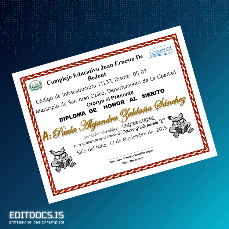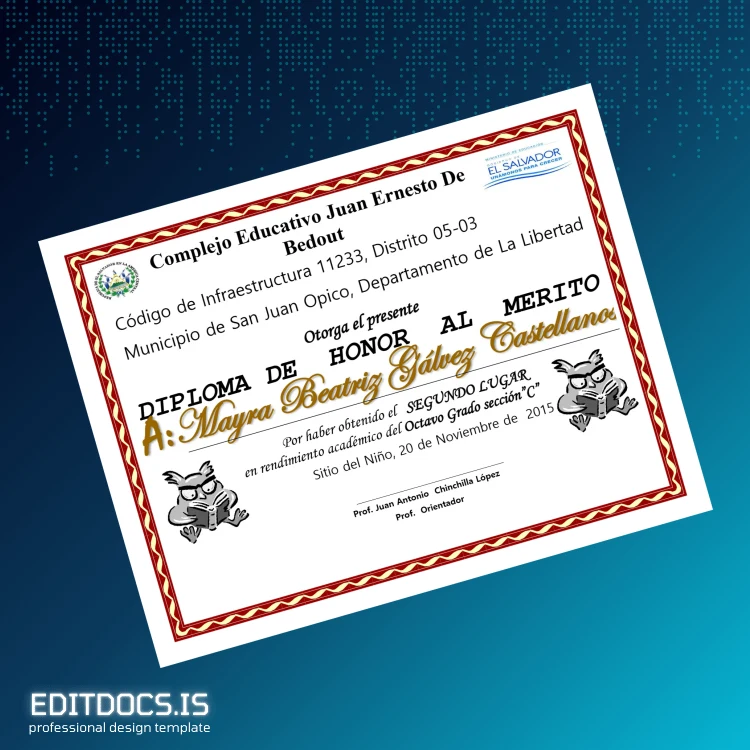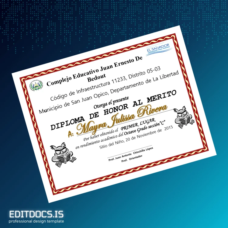 Easily edit and customize the El Salvador Complejo Educativo Juan Ernesto de Bedout Honor Diploma Template (Word & PDF) for fast, professional diploma replacement.