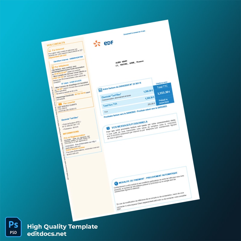 • Includes authentic fonts and layout style: Accurately replicates the official EDF billing template to enhance credibility.