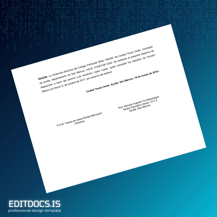 Discover the convenience of quickly and professionally producing a replacement diploma with the Guatemala Colegio Nuestra Señora de la Asuncion Basic Diploma Template. This editable digital diploma is specifically designed for easy customization, ensuring you get a polished document without delay. Ideal for those who need a backup copy or a replacement diploma, this template integrates seamlessly into common editing software, allowing you to update and tailor the content effortlessly.