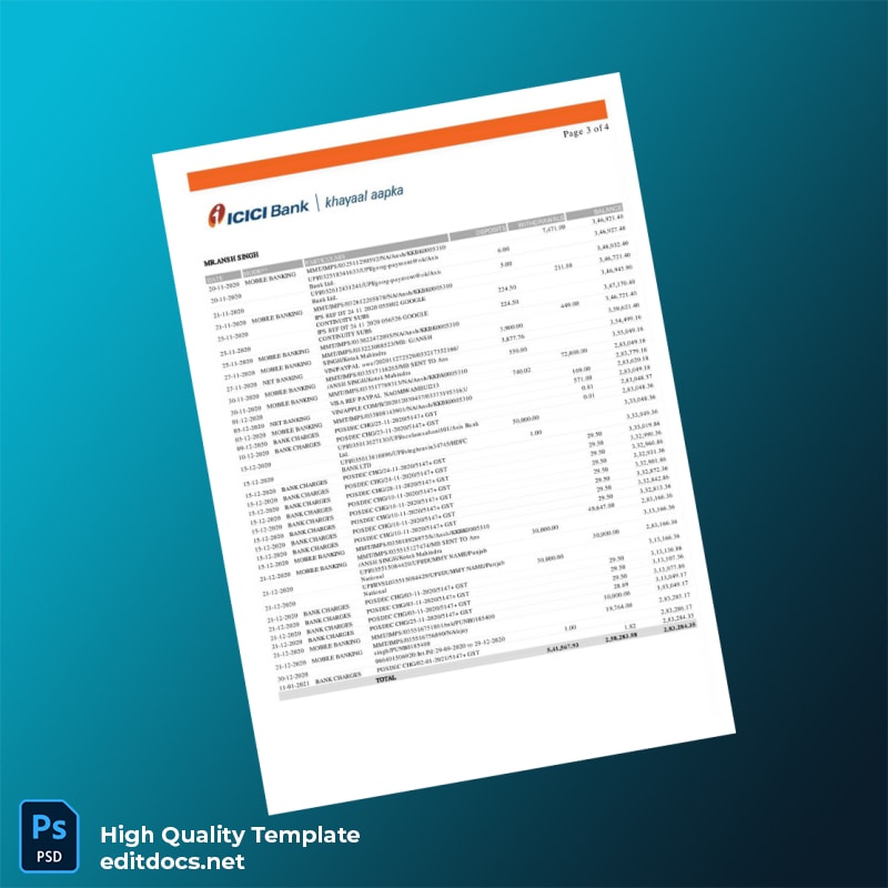 India ICRI Bank Bank Statement Template in Word and PDF formats 4 page