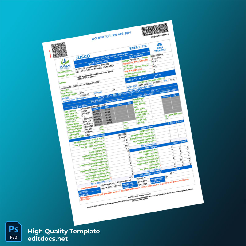 Empower yourself with the India JUSCO Editable Electricity Bill Template – where professional elegance meets practical convenience. Whether you need a quick water bill template word version or an editable utility bill template pdf file, this product ensures you stay compliant, professional, and prepared. Don’t wait to replace or generate your documents; access our trusted utility bill template resources now and experience seamless utility bill generation tailored to your needs.