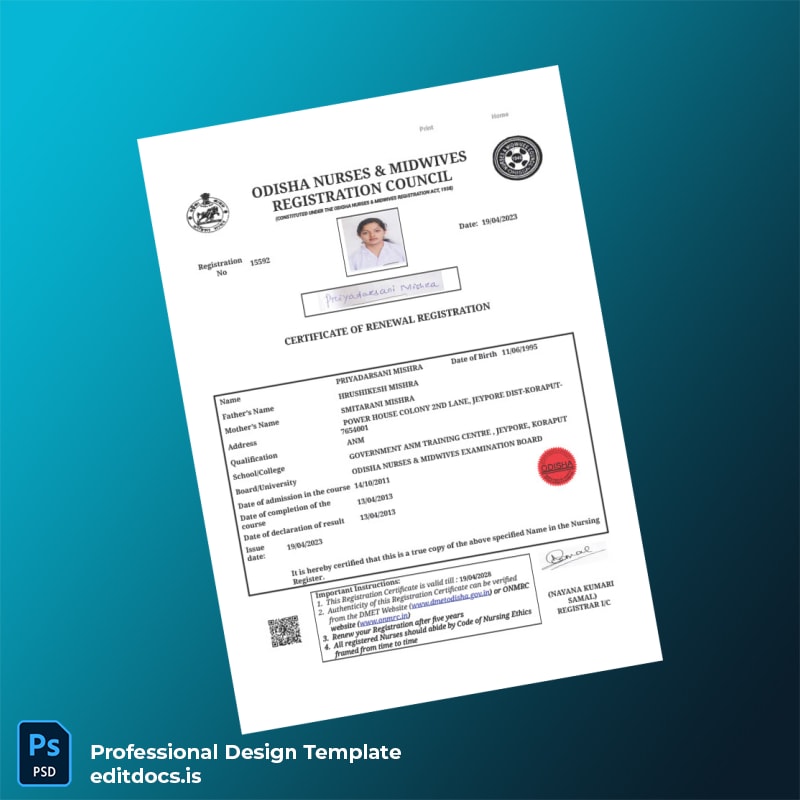 India Odisha Nurses Midwives Registration Council Certificate of Renewal Registration Template (Word & PDF)