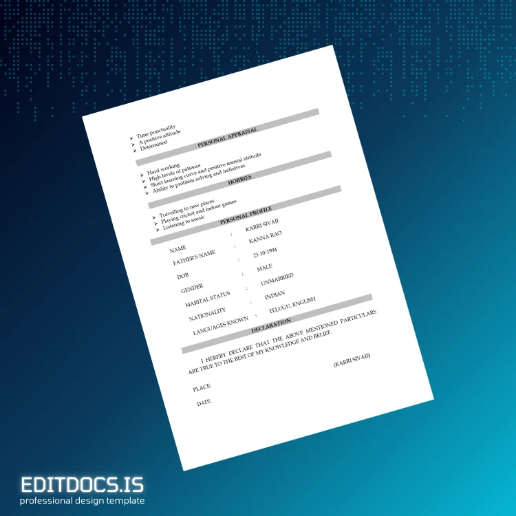 | Editable Fields | Name, dates, registration number, signature placeholders |
