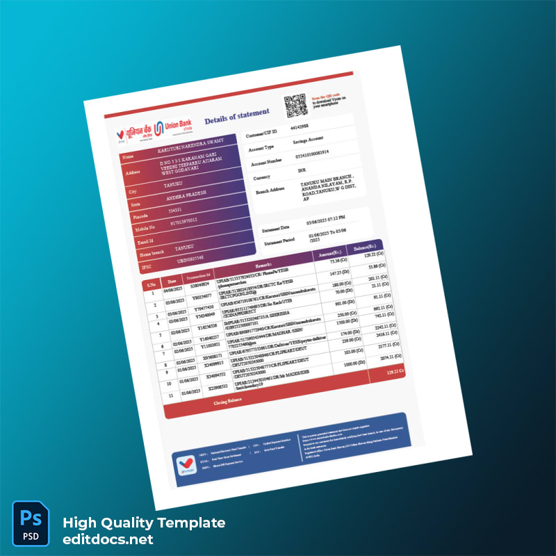 Need a bank statement replacement fast? The India Union Bank Statement Template offers a seamless solution for professionals requiring accurate and visually appealing bank statements in both Word and PDF formats. Perfect for individuals facing lost documents, urgent replacements, or needing to demonstrate financial stability.