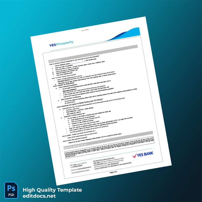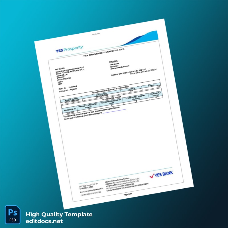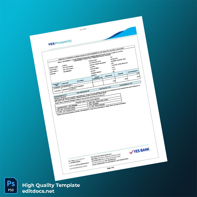 India YES Bank Statement Template in Word and PDF formats 6 page