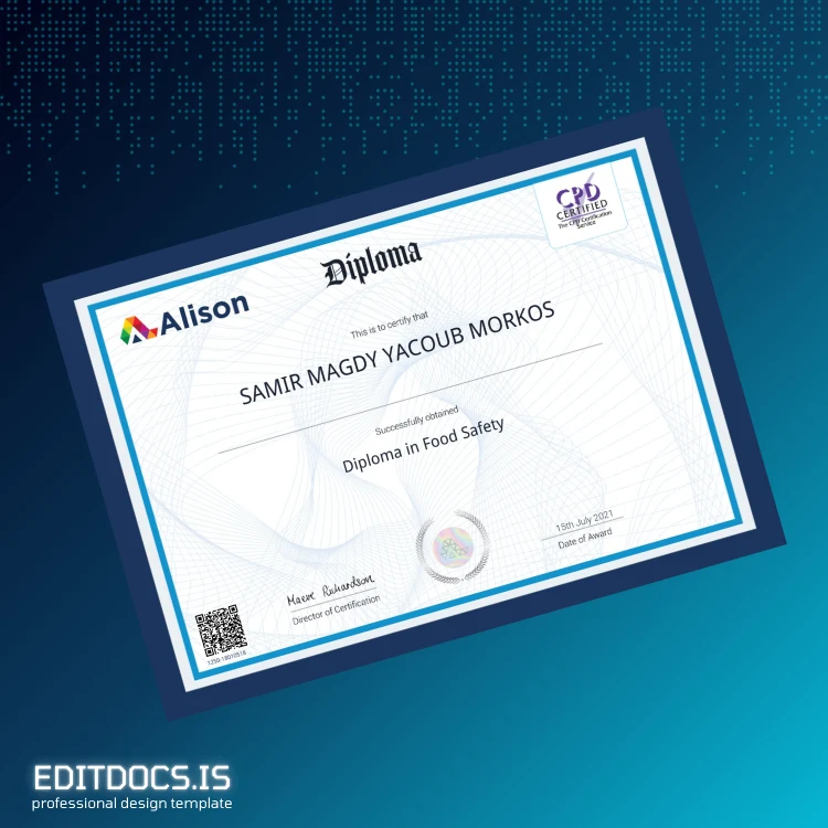 The Ireland Alison Diploma in Food Safety Template is a professionally designed, editable digital certificate available in Word and PDF formats. This customizable template makes it effortless to generate a high-quality food safety diploma quickly and efficiently, whether you need a replacement copy, backup, or a novelty diploma design. Perfect for instructors, students, and organizations, this template delivers a seamless editing experience combined with professional print-ready quality.