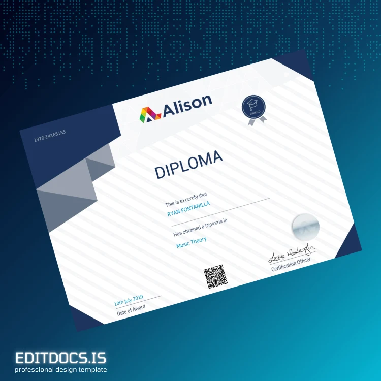 This Ireland Alison Diploma in Music Theory Template (Word & PDF) is a professionally designed digital certificate template perfect for quickly creating an authentic-looking diploma. Ideal as a replacement diploma template or a customizable degree template, this blank diploma form ensures you can effortlessly design a document that meets your specific needs with ease. Whether you’ve lost your original or need a novelty diploma design for creative purposes, this digital diploma download offers a seamless editing experience.