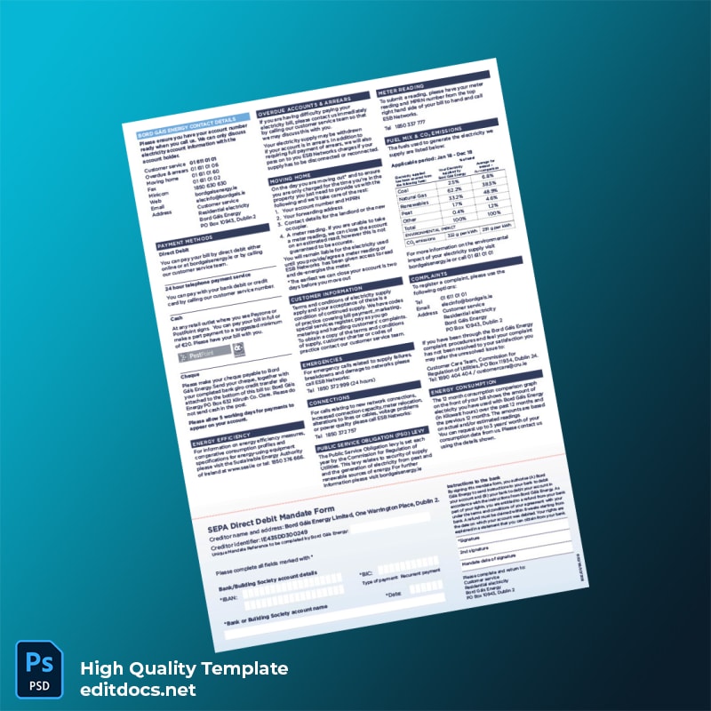 Don’t let missing utility bills hinder your professional and personal affairs. This Ireland Bord G Is Energy Editable Electricity Bill Template offers a seamless, trustworthy way to provide your utility bill proof of address, tailored specifically for electricity accounts. For a broader selection of utility-based verification documents, visit the utility bill template category and find the perfect match for your requirements.