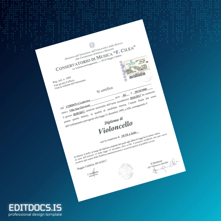 This editable diploma template is designed for quick and easy customization, allowing professionals to recreate the Italy Conservatorio di Musica _F. Cilea_ Diploma in Cello certificate with precision. Ideal for those who need a replacement diploma or a professional backup, this template offers a seamless way to generate a polished document in both Word and PDF formats.