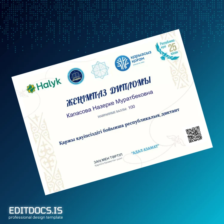 Our Kazakhstan Halyk University Winner Diploma Template (Word & PDF) is a professionally designed, fully customizable digital diploma file that allows you to swiftly create a high-quality replacement or novelty diploma. Ideal for those needing an editable diploma form, this template ensures convenient access and effortless editing, perfect for academic or personal use. Explore other options in our editable diploma template category to complement your needs.