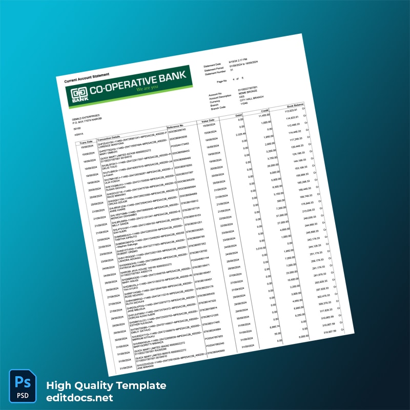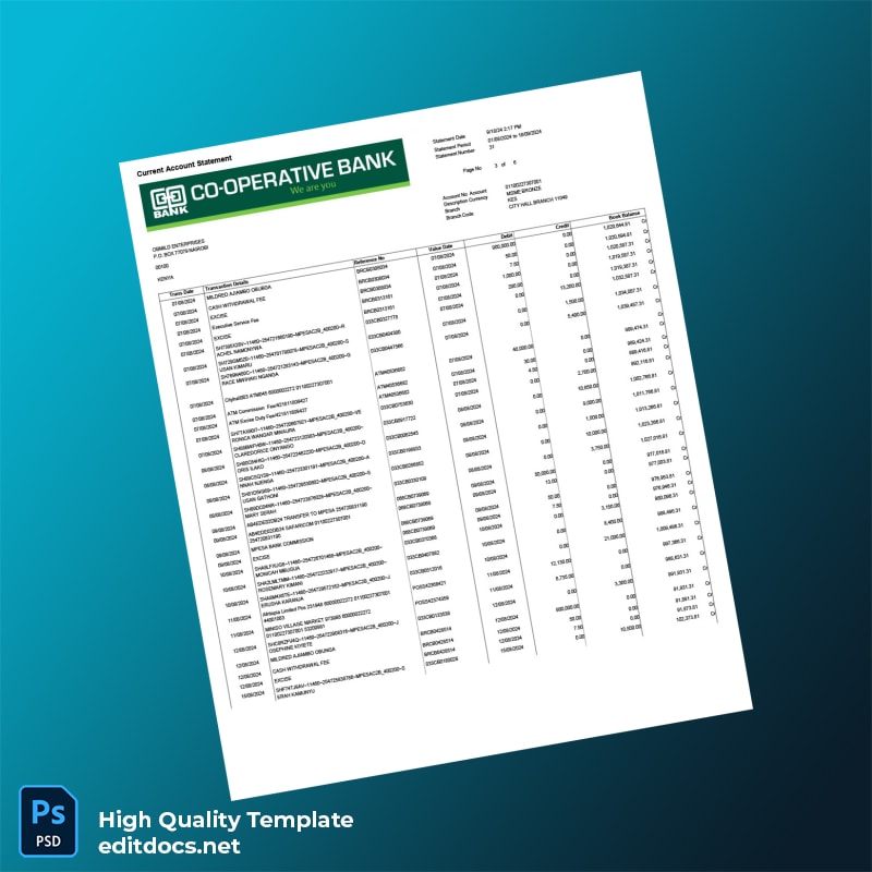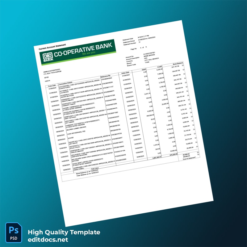 Imagine you’ve misplaced your bank statement right before an important business meeting. You need a replacement fast, and the Kenya Cooperative Bank Account Statement Template can help. By utilizing this bank statement template, you’ll have a professionally formatted document ready in minutes, ensuring you never miss an opportunity again.
