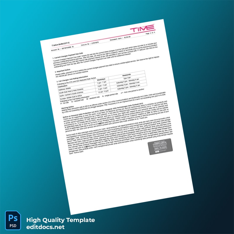 Malaysia TT dotCom Sdn Bhd Editable Internet Bill Template in Word and PDF Formats