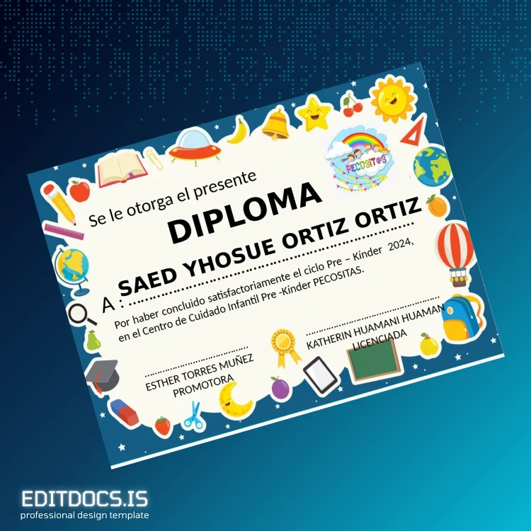 This editable diploma template is designed specifically for the Mexico Centro de Cuidado Infantil Pre-Kínder Pecositas, offering a professional, customizable option for printing official-looking diplomas in both Word and PDF formats. Whether you need a replacement diploma, a novelty certificate for school events, or a backup copy, this digital diploma download gives you complete control over customization with ease and efficiency. The template ensures you can quickly generate polished diplomas suitable for professional use or personal needs.