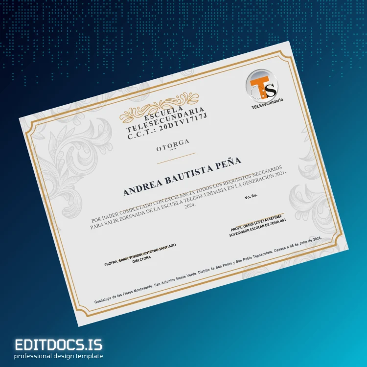 This digital Mexico Escuela Telesecundaria High School Diploma Template (Word & PDF) offers a seamless solution for educators, administrators, and individuals who need a professional and customizable diploma quickly. Designed as an editable diploma certificate Word and PDF template, it enables you to create a personalized, replacement diploma or a novelty diploma design with ease and precision.