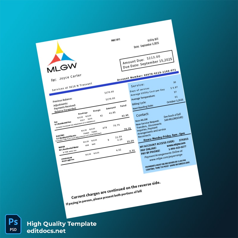 MLGW Editable Utility Bill Template in Word and PDF Formats
