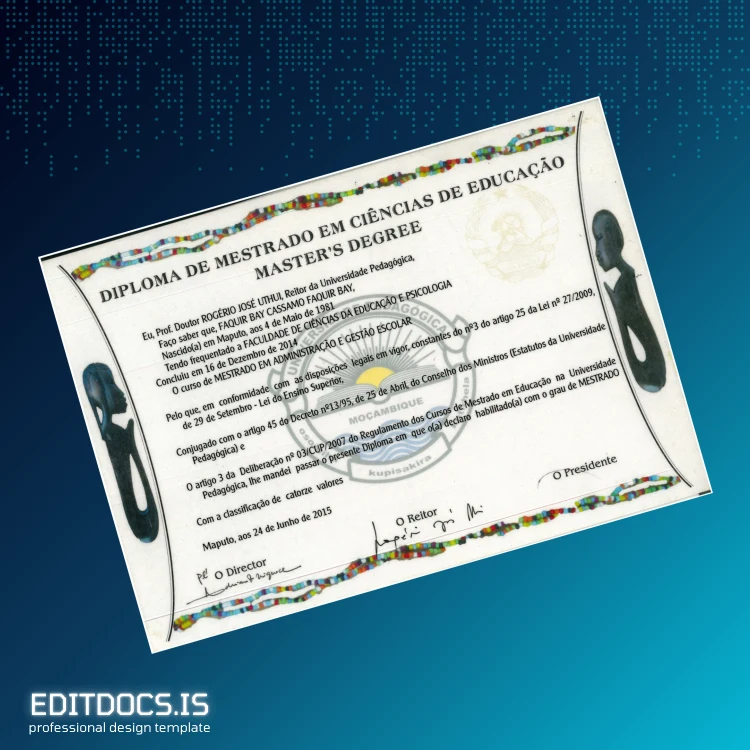 With this comprehensive approach, recreating your Mozambique Universidade Pedagógica Master’s Degree in Educational Sciences has never been easier or more efficient. This novelty diploma design template supports professionals dealing with document replacement, verification, and archival preservation, providing a convenient and high-quality digital diploma download experience.