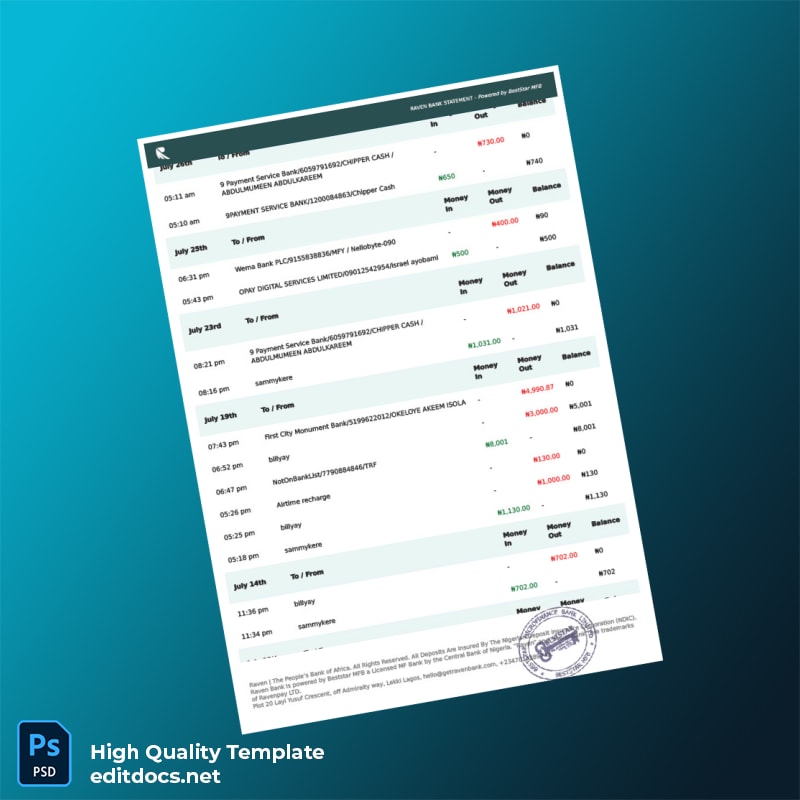 Have you ever faced the frustration of needing a bank statement urgently, only to find yourself without the essential document? Whether lost, stolen, or expired, our Nigeria Raven Bank Statement Template is designed to provide an immediate solution, allowing you to create a professional-looking bank statement in both Word and PDF formats.