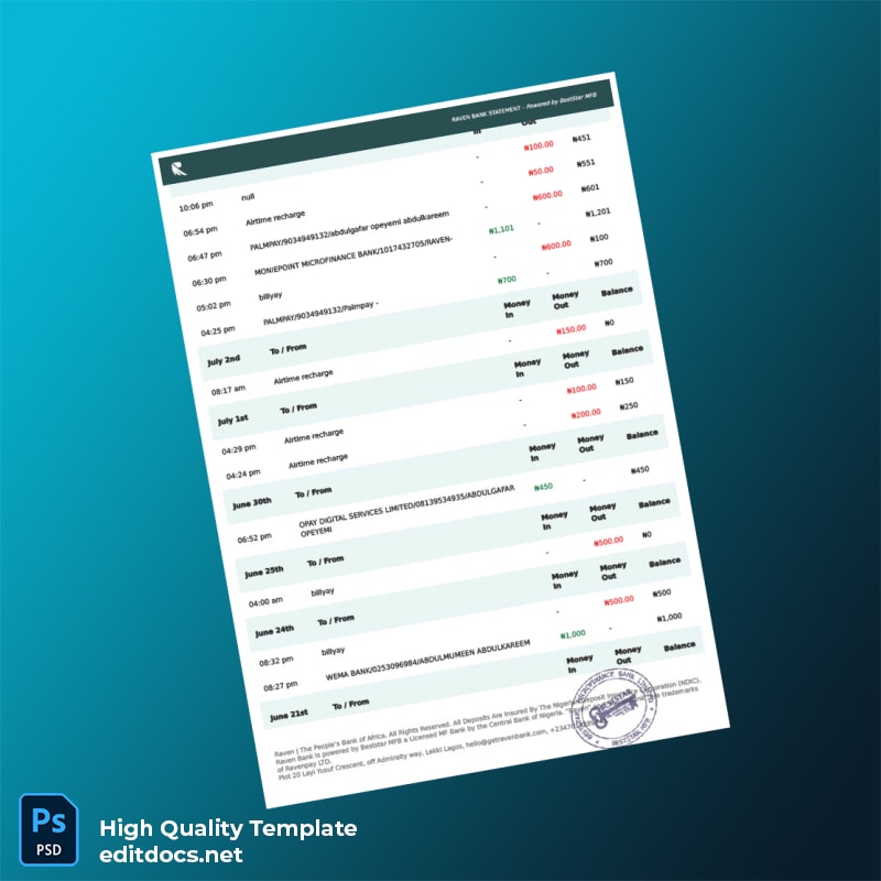 Nigeria Raven Bank Statement Template – Word and PDF Formats