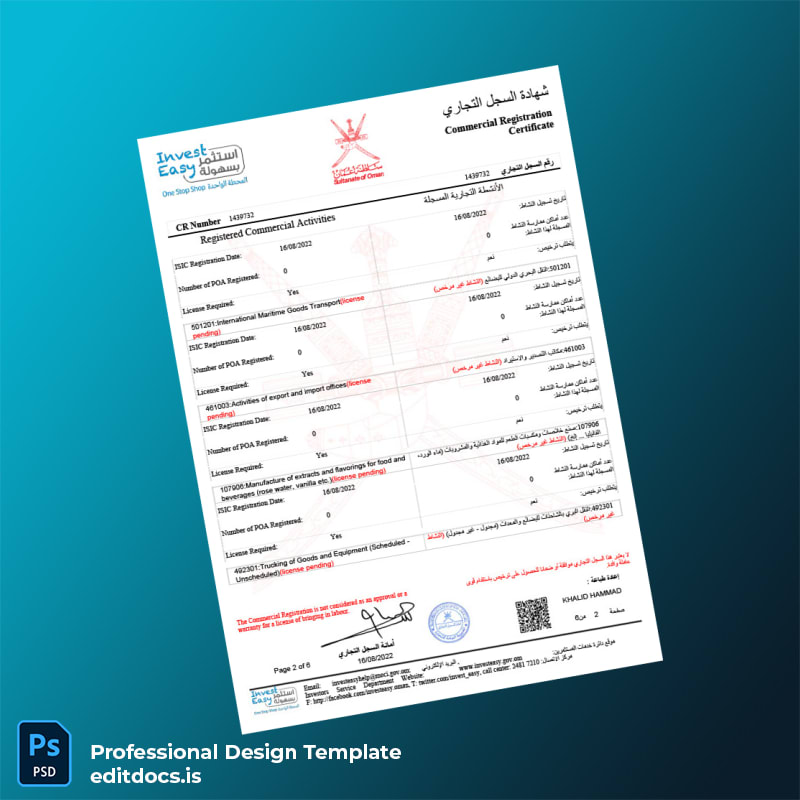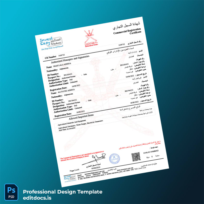 Oman Ministry of Commerce Commercial Registration Certificate Template (Word & PDF)