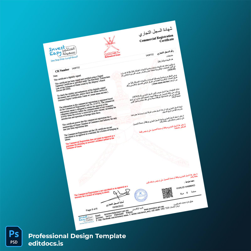 Don’t let administrative setbacks hinder your business operations. Invest in the Oman Ministry of Commerce Commercial Registration Certificate Template (Word & PDF) to ensure your commercial registration details are always accessible, editable, and ready for immediate use. Secure your professional image and compliance standing by downloading this essential tool now.