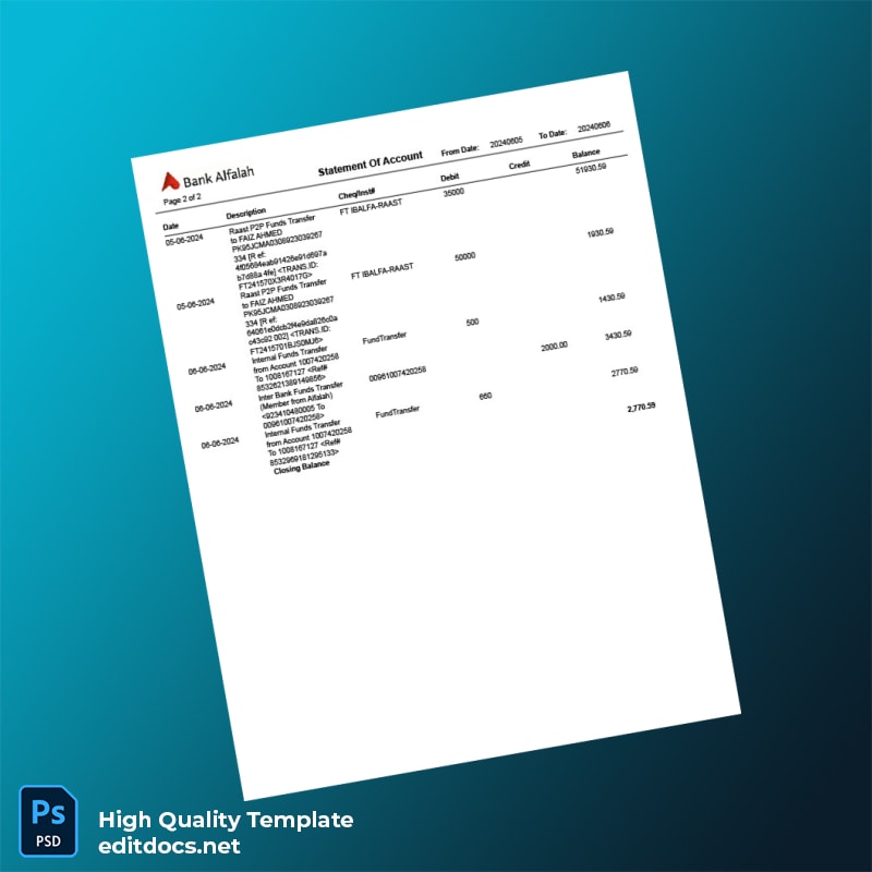 Pakistan Alfalah Bank Editable Bank Statement Template in Word and PDF Formats