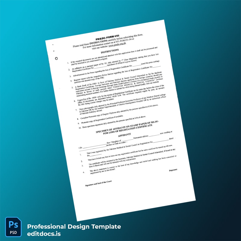 Download the Pakistan Pakistan Medical Dental Council Duplicate Registration Certificate Template (Word & PDF) for quick, professional certificate replacement.