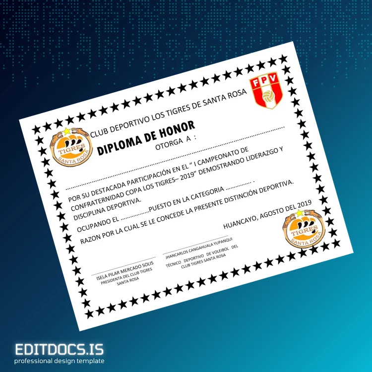 Easily edit and customize the Peru Club Deportivo Los Tigres de Santa Rosa Honor Diploma Template (Word & PDF) for quick, professional replacement diplomas.