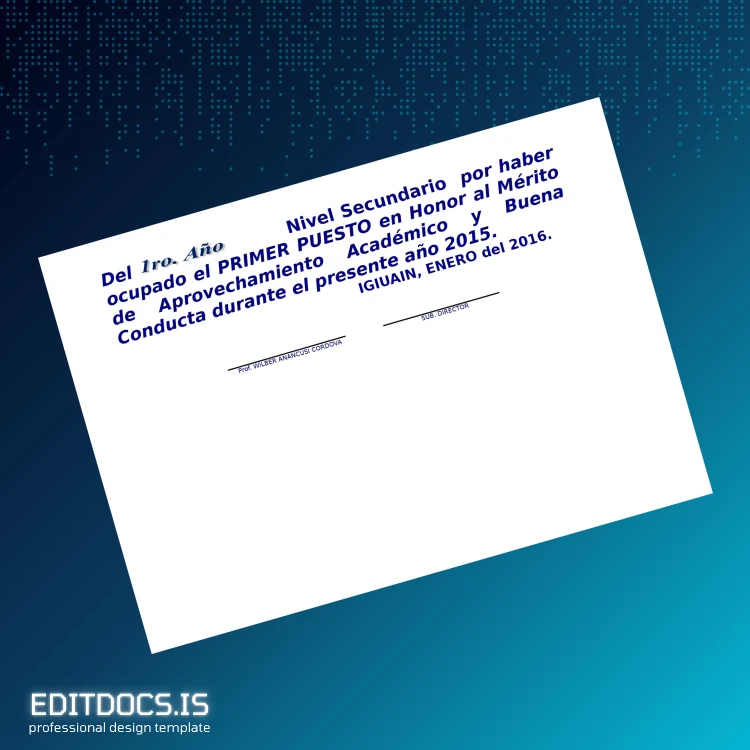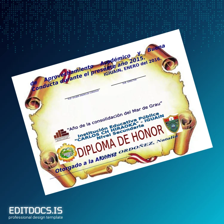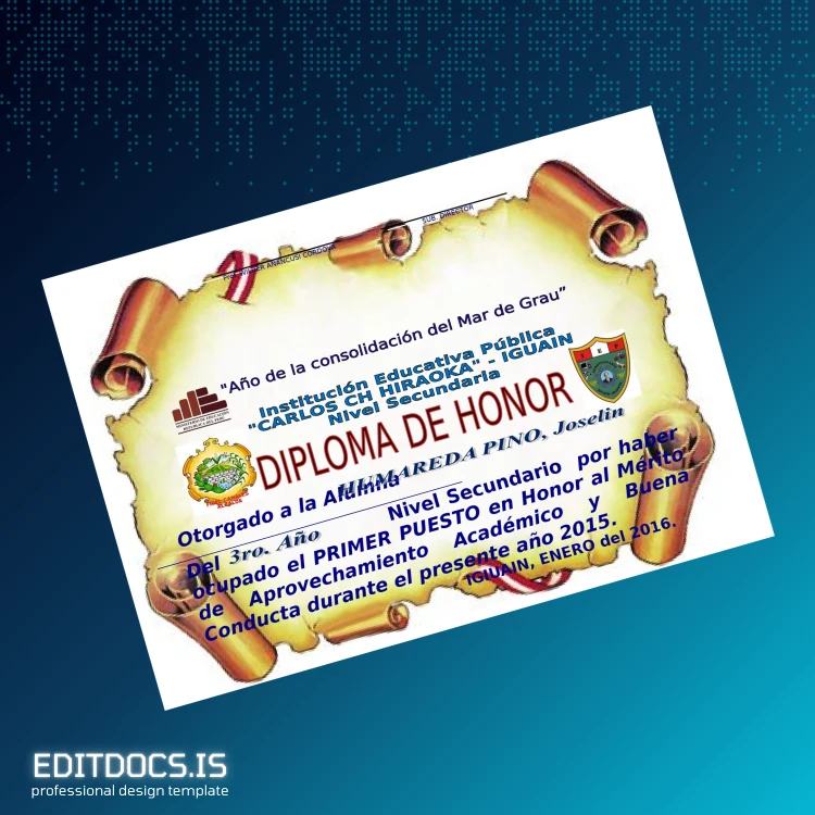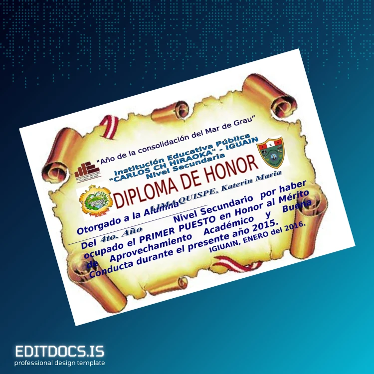 Our Peru Educational Institution _Carlos Ch Hiraoka_ High School Diploma Template offers a professional and fully editable digital certificate designed to help you replace or restore lost or damaged diplomas quickly. This customizable degree template comes in Word and PDF formats, allowing seamless modification of all essential details. Perfect for individuals seeking a polished and accurate diploma replica, this file ensures your document is ready for printing in no time. Browse more options in the editable diploma template category to find the best match for your needs.