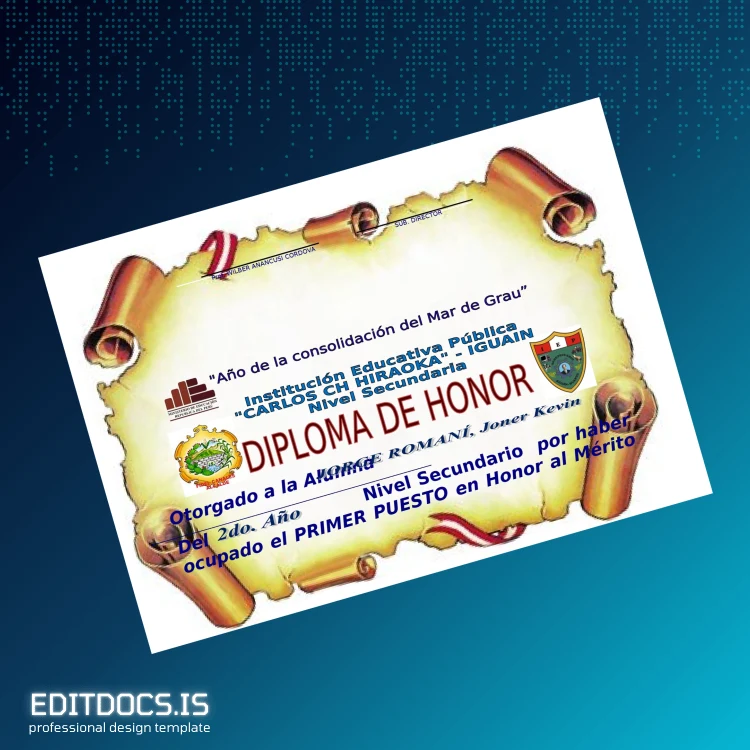 Easily edit the Peru Educational Institution _Carlos Ch Hiraoka_ High School Diploma Template (Word & PDF) for fast, professional document replacement.