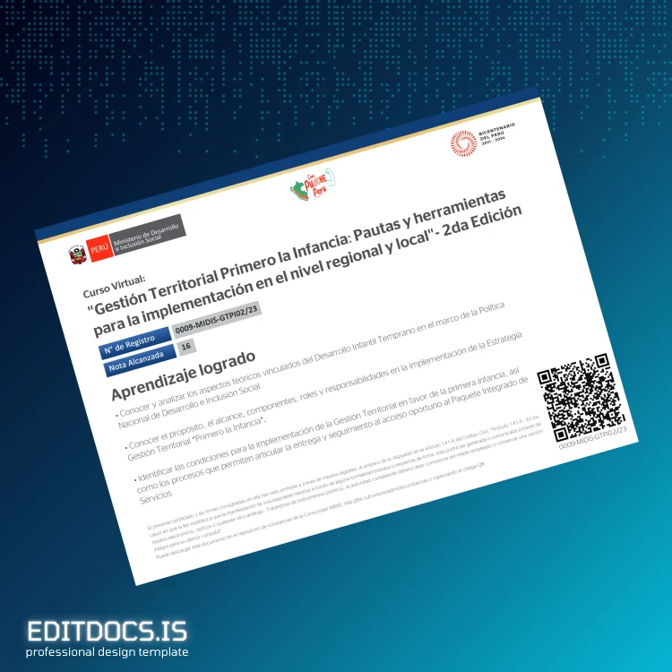 This editable diploma template offers a professional and customizable solution for quickly producing a replacement or backup of the Peru Ministry of Development and Social Inclusion Completion Certificate in Territorial Management for Children. Designed for ease of use and adaptable to individual needs, this digital diploma download includes both Word and PDF formats, allowing seamless editing and high-quality printing for official presentation. Whether you need a prompt document restoration or a personalized certificate, this Word & PDF template ensures precision and flexibility.
