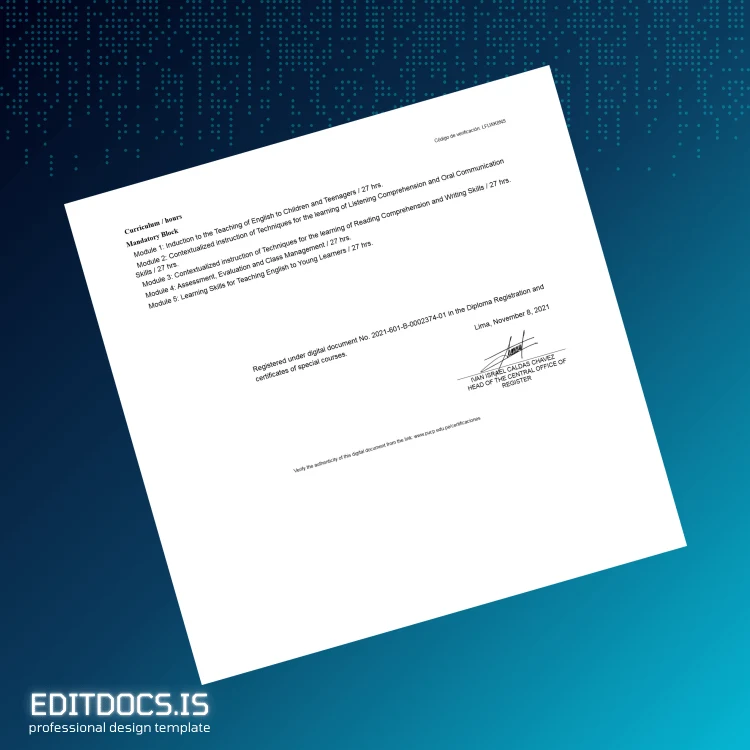 This editable diploma template offers an easy and professional way to recreate your Peru Pontifical Catholic University of Peru diploma in Study of Methodological Principles for TEFL Children and Teenagers. Ideal for those seeking a customizable degree template, this digital diploma download ensures you can replace or back up your diploma with an authentic-looking, high-quality document. Designed to be fully editable in Word and PDF formats, it allows precise customization of all certificate details without any complexity.