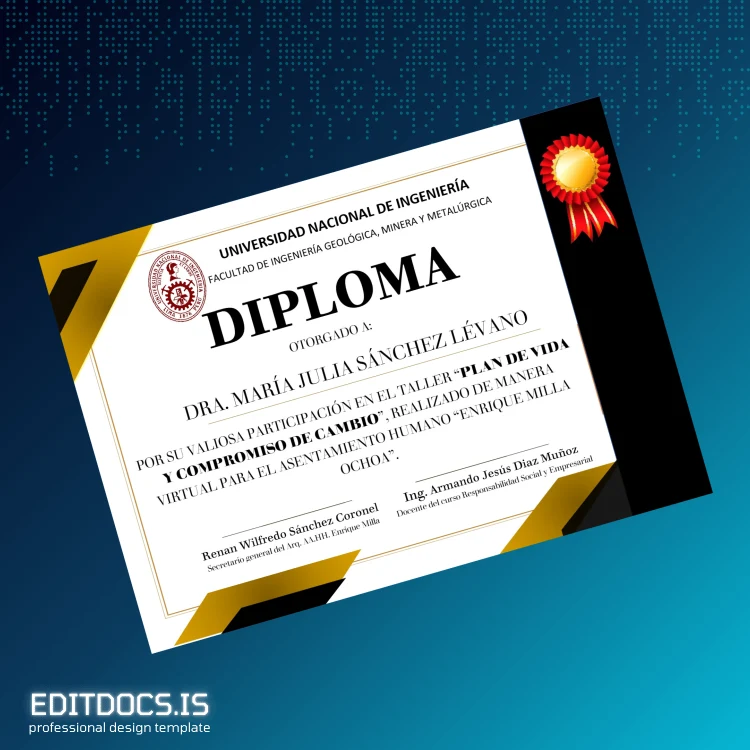 This comprehensive digital diploma template allows you to easily create a professional replica of the Peru Universidad Nacional de Ingeniería Diploma Certificate. Designed for individuals who need to restore or replace their official diploma quickly, this editable template offers a seamless solution combining convenience and high-resolution quality. Perfect for students, alumni, or professionals aiming for a customized document, this file supports both Word and PDF formats, enabling efficient edits and smooth printing options.