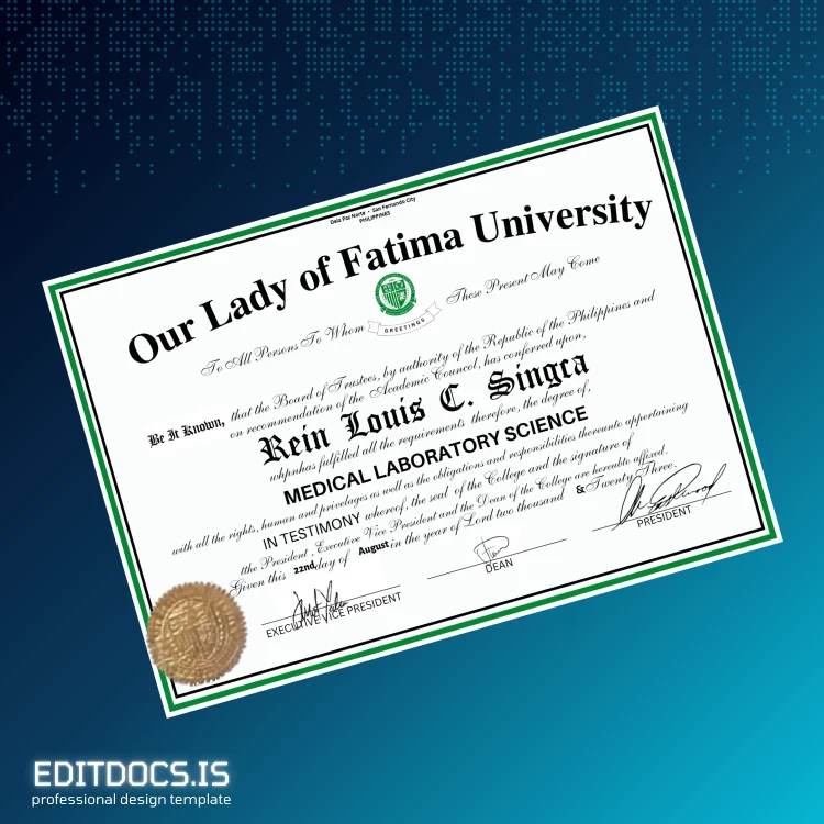 Discover the ultimate solution for fast and professional diploma customization with the Philippines Our Lady of Fatima University Bachelor of Science in Medical Laboratory Science Template available in Word and PDF formats. This digital diploma download offers a seamless way to produce a polished diploma design that meets your restoration or backup needs, perfectly suited for students, graduates, or professionals seeking a customizable degree template. Compatible with widely-used editing software, this template allows you to quickly and easily tailor it to your specifications without hassle.