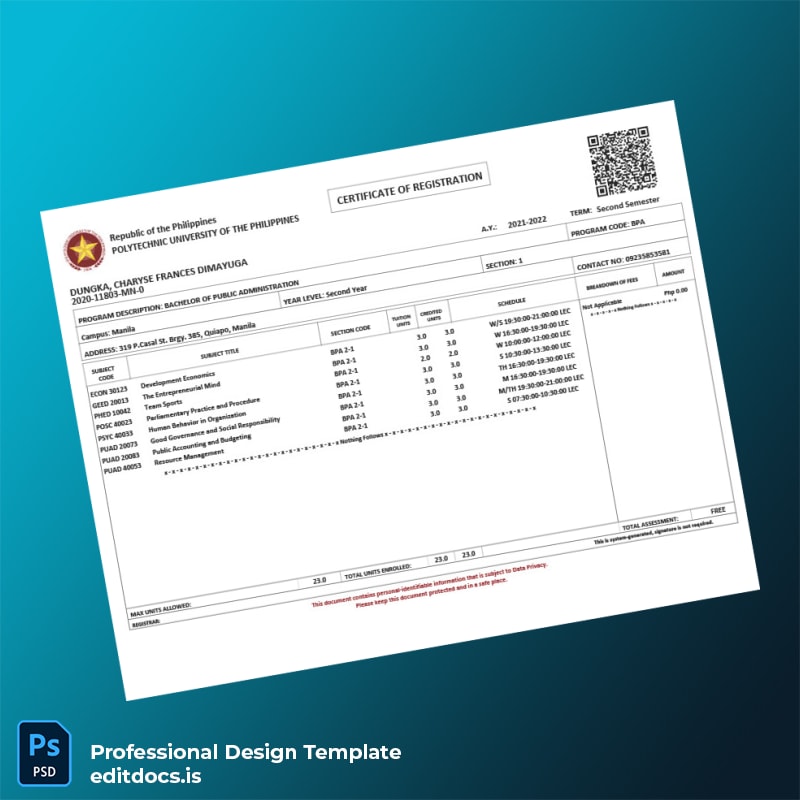 Philippines Polytechnic University Registration Certificate Template (Word & PDF)