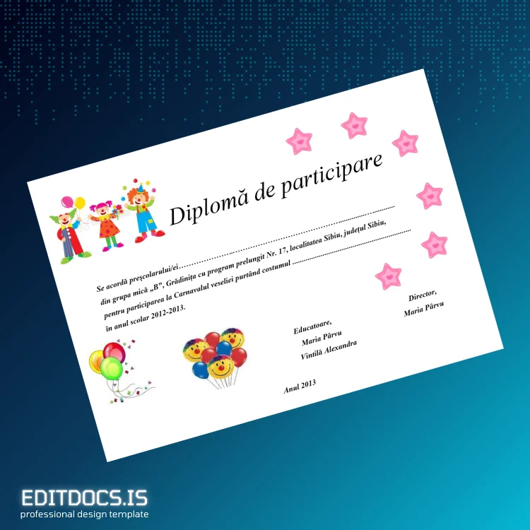 This editable diploma template provides a professional and customizable solution for recreating the Romania Grădinița Nr. 17 participation diploma quickly and efficiently. Designed for educators, administrators, and event organizers, this digital diploma download offers seamless editing features and compatibility with popular formats such as Word and PDF.