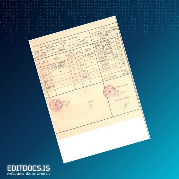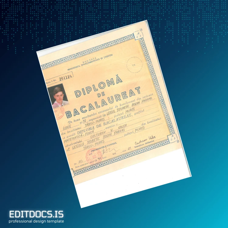 This editable diploma template offers a seamless solution for professionals seeking a customizable and high-quality digital replica of the Romania Liceul Teoretic Bolyai Farkas Bacalaureat Diploma. Designed for easy modification in Word and PDF formats, this template caters to educators, alumni, and institutions needing a reliable and professional replacement diploma or an official-looking novelty certificate. Whether you require a blank diploma form to personalize or a sophisticated design for academic purposes, this digital diploma download serves your needs swiftly and efficiently.