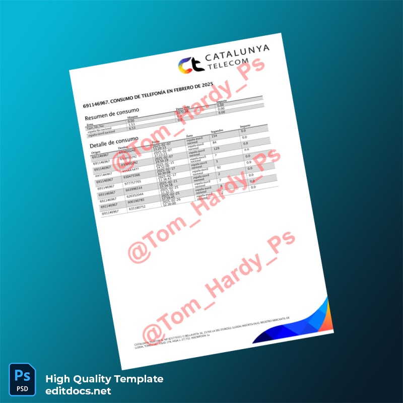 Spain Catalunya Telecom Editable Utility Bill Template in Word and PDF Formats