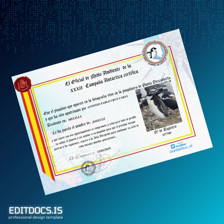 This editable diploma template offers a professional and customizable solution for individuals seeking an official-looking environmental certificate from Spain. Easily accessible in popular formats, this digital download facilitates quick modification and printing, ideal for those needing a replacement or restoration of important documentation.