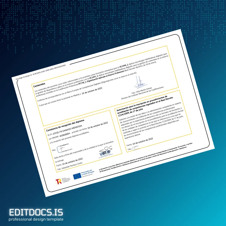 After customization, prepare your Spain Union General of Workers UGT Diploma Certificate template for print. The file is optimized for standard A4 and letter paper sizes and supports high-resolution output to ensure crisp, clear text and imagery. Print on quality certificate paper at home or choose a professional print service for the best presentation. This approach guarantees your replacement document looks authentic and maintains a polished appearance.