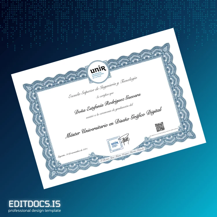 Easily edit the Spain UNIR International University Master’s Degree template (Word & PDF) for quick, professional replacement or customization.