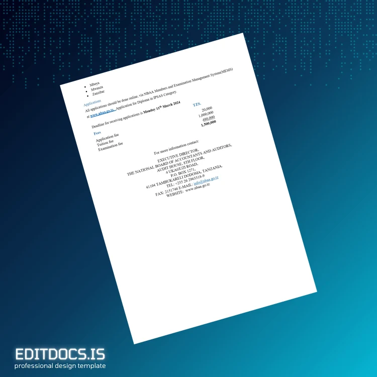 This editable diploma template offers a professional and customizable solution for recreating your Tanzania National Board of Accountants and Auditors Diploma in IPSAS Certificate. Designed for ease of use, this digital diploma download allows you to restore lost or damaged documents with precision and style. Whether for personal record-keeping or official replacement needs, this template ensures you maintain a polished and authentic appearance.