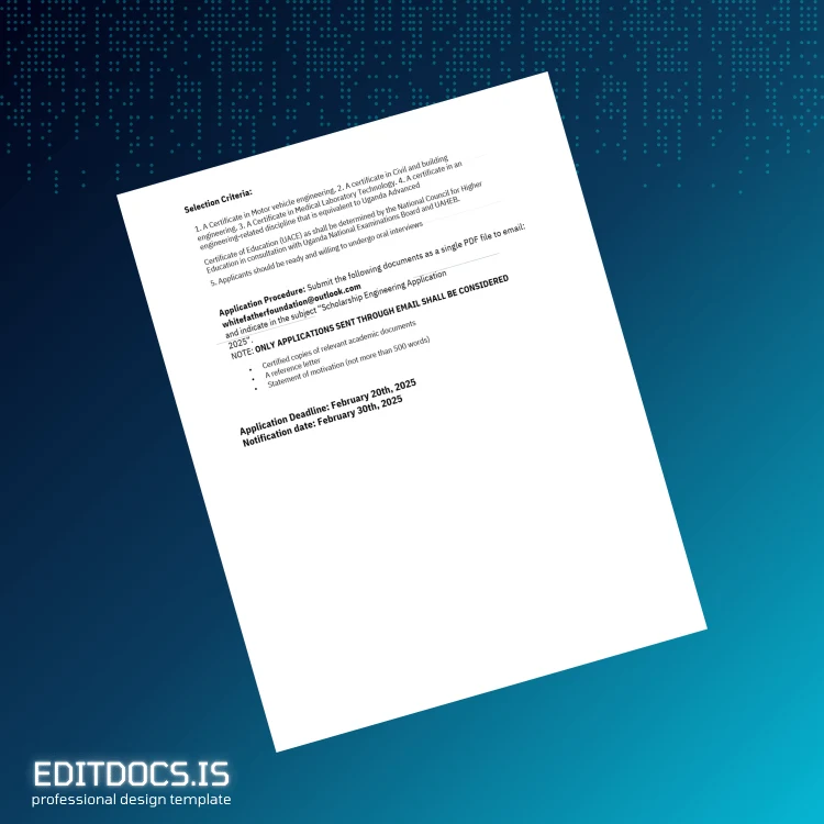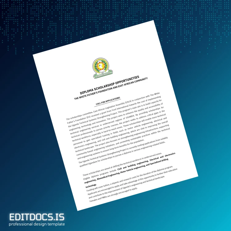 This editable diploma template offers a versatile and professional solution for those needing a high-quality digital copy of the Uganda White Father’s Foundation Technical Diploma. Available in both Word and PDF formats, it allows for seamless customization to meet your specific needs, whether for replacement, archival, or novelty purposes. Designed with attention to detail, it serves professionals and individuals who require an accurate and editable diploma document.