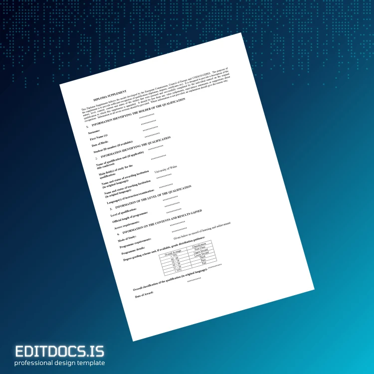 Discover the convenience of our UK University of Wales Diploma Supplement Template, designed for seamless customization and professional-quality results. This editable degree template comes in both Word and PDF formats, enabling you to create a perfect replacement diploma quickly and efficiently. Whether you need a blank diploma form for personal use or a novelty diploma design for demonstration, this digital diploma download offers versatile options to meet your needs. For more editable diploma templates, explore our extensive editable diploma template collection.